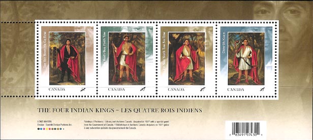 Issued on April 19, 2010 to celebrate the 300th anniversary of the portraits representing the 4 Indian Kings from the Iroquoian Confederacy who travelled to London, UK to meet with Queen Anne. Having been so impressed by her visitors, the Queen commissioned John Vereslt a court painter to paint their portraits. Each portrait shows a King with their hereditary clan animal at their side. In all of the portraits the four kings are wearing red cloaks that were made for them and were gifts from Queen Anne.