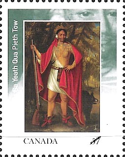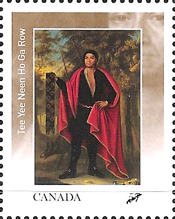 Next is Sa Ga Yeath Qua Pieth Tow (the stamp on the right above) of the Bear Clan. Christened as Peter Brant, he was the grandfather of Joseph Brant. He was pictured with a musket and his very elaborate tattoos. To his left you can see the bear representing his hereditary clan. Peter Brant was a Catholic and was the leading king of the Mohawks.